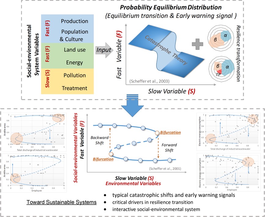 Pursuit of sustainability requires a systematic approach to understand a system's specific dynamics to adapt and enhance from disturbances in social-environmental systems. We developed a systematic resilience assessment of social-environmental systems by connecting catastrophe theory and probability distribution equilibrium. Catastrophe models were used to calculate resilience shifts between slow and fast variables; afterwards, two resilience transition modes (“Less resilient” or “More resilient”)were addressed by using probability distribution equilibrium analysis. A tipping point that occurs in “Less resilient” system suggests that the critical resilience transition can be an early warning signal of approaching threshold. Catastrophic shifts were explored between the interacting social-environmental sub-systems of land use and energy (fast variables) and environmental pollution (slow variables), which also identifies the critical factors in maintaining the integrated social-environmental resilience. Furthermore, the early warning signals enable the adaptability of urban systems and their resilience to perturbations, and provide guidelines for urban social-environmental management.