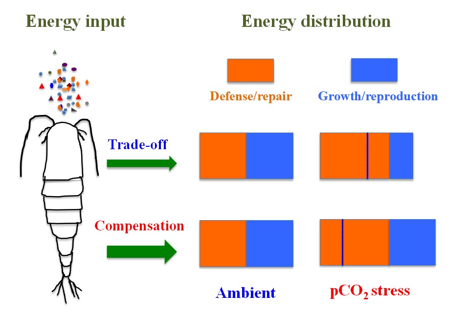 Figure 1. Energetic trade-off hypothesis showing how compensatory response can potentially offset the negative impacts of pCO2 stress on copepods as exemplified by increased feeding under excess food provision. Open and closed stars indicate the trade-off for defense/repair and the compensation for growth/reproduction, respectively. Under tradeoff situation, the defense/repair takes higher proportion compared to the growth/reproduction energy distribution in a given 100% energy distribution condition. Under compensation situation, the OA (e.g. pCO2 stress) reinforces organism to take even higher energy distribution (> 100%) to compensate the stress to re-allocate the energy in defense/repair.