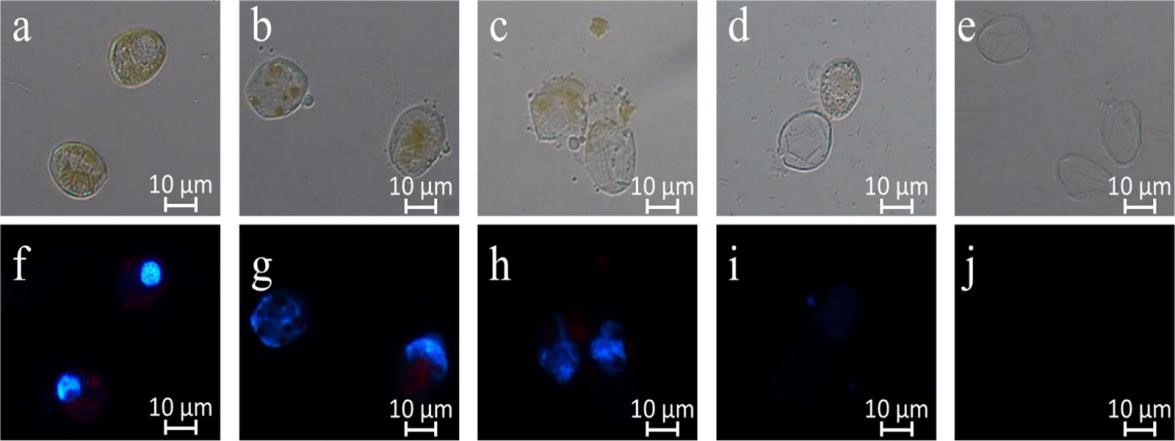 Figure 4. Changes in the morphology and nucleus of P. donghaiense cells during cell death. Algal cells were harvested by centrifugation after 0 h (a and f), 12 h (b and g), 24 h (c and h), 48 h (d and i), or 72 h (e and j) of exposure to 5% of the Y42 strain supernatant, stained with DAPI (5 g/ml) for 5 min at room temperature in the dark, and viewed with a fluorescence microscope. Morphological changes were visualized using bright-field illumination (a to e), and nucleus changes were visualized using UV illumination (f to j).