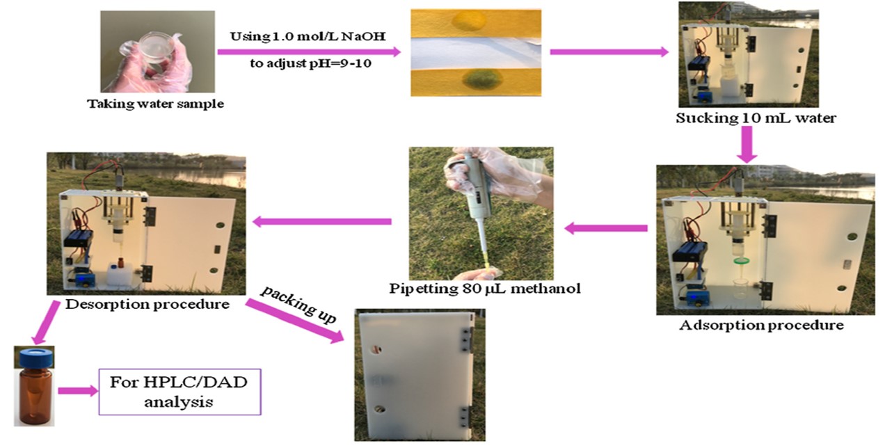 On-site sample preparation is highly desired because it avoids the transportation of large-volume samples and ensures the accuracy of the analytical results. In this work, a portable prototype of tip microextraction device (TMD) was designed and developed for on-site sample pretreatment. The assembly procedure of TMD is quite simple. Firstly, polymeric ionic liquid (PIL)-based adsorbent was in-situ prepared in a pipette tip. After that, the tip was connected with a syringe which was driven by a bidirectional motor. The flow rates in adsorption and desorption steps were controlled accurately by the motor. To evaluate the practicability of the developed device, the TMD was used to on-site sample preparation of waters and combined with high-performance liquid chromatography with diode array detection to measure trace estrogens in water samples. Under the most favorable conditions, the limits of detection (LODs, S/N = 3) for the target analytes were in the range of 4.9–22 ng/L, with good coefficients of determination. Confirmatory study well evidences that the extraction performance of TMD is comparable to that of the traditional laboratory solid-phase extraction process, but the proposed TMD is more simple and convenient. At the same time, the TMD avoids complicated sampling and transferring steps of large-volume water samples.