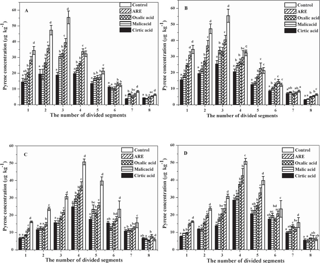 Figure 3. Distribution of pyrene on the soil plates: The experiments were performed on Jiulong Estuary sediment plate and Dongzhai Harbour sediment plate using root exudates at 160 mmol L− 1 (A and C) and 10 mmol L− 1 (B and D) as developing solvents. Distilled water was used as control. Error bar represent the standard deviation (SD). Different lowercase letters indicate significant differences among segments of plate with different root exudates - treatments at the P < 0.05 level according to lsd test.