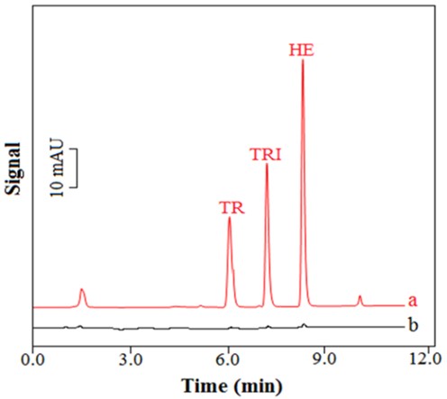 Figure 4. HPLC chromatograms of triazoles. (a) Spiked sample with each analyte at 100.0 μg/L and treated with on-line MMC/IT-SPME. (b) Direct injection of spiked sample with each analyte at 100.0 μg/L. Conditions: volume of sample, 6.0 mL; adsorption flow rate, 0.2 mL/min; desorption solvent, 80 µL ACN/water (70/30, v/v); desorption flow rate, 50.0 µL/min; sample pH, 8.0.