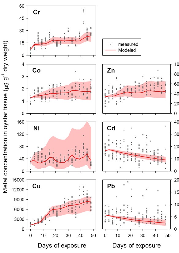 Figure 3. Metal bioaccumulation in soft tissues of oysters at site 1 during the 48 day transplantation. The × symbols represent measured concentrations; the red curves and the shaded areas are average concentrations and 95% confidence intervals predicted by the model based on the parameter samples from the MCMC fittings, respectively. See Figures S7-S13 for the parameter samples.