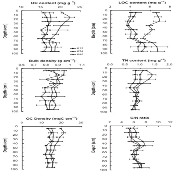 Figure 2. Distribution of the soil organic carbon (OC) content, bulk density, OC density, labile OC (LOC) content, total nitrogen (TN) content and molar C/N ratio in different soil depth sections in the three restored K. obovata forests. The means and standard deviations of three replicates are shown. K12: 12-year forest; K24: 24- year forest; K48: 48-year forest.