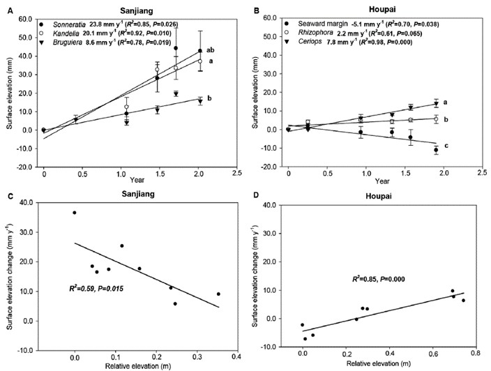 Figure 3. Surface elevation changes (mean ± SE) at Sanjiang (A) and Houpai (B) in Dongzhaigang Bay, Hainan, China. The relationship between surface elevation change and relative elevation of mangrove ground at Sanjiang (C) and Houpai (D). Significant differences (p < 0.05) among the slopes are indicated by different letters. at houpai and sanjiang, the elevation of every rset-mh station was relative to that of the seaward margin (i.e., the non-vegetated mudflat adjacent to the forest edge).