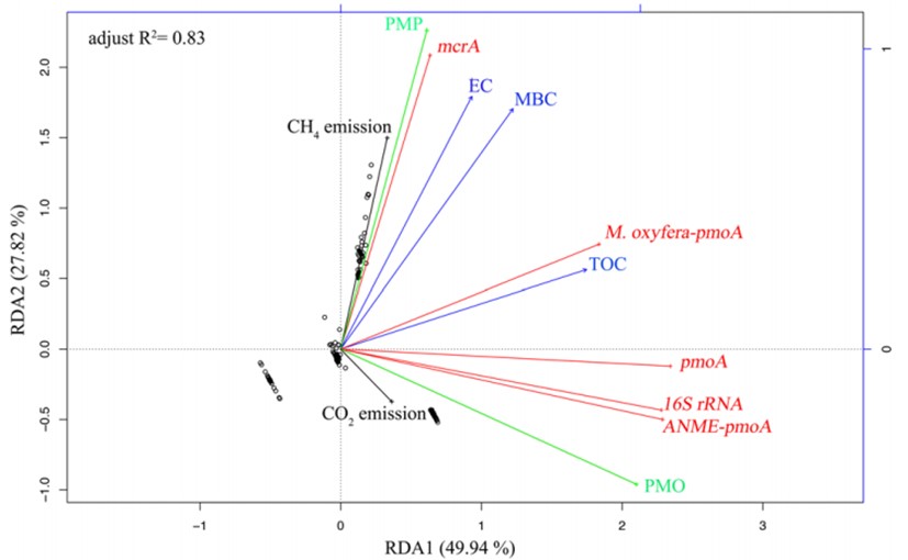 Figure 5. Permutation (number: 9999) test for redundancy analysis (RDA) under reduced model of carbon gases emission, PMP, PMO and functional microbial abundance with enviromental biogeochemical properties. TOC: total organic carbon; EC: electrical conductivity; MBC: microbial biomass carbon; PMO: potential methane oxidation; PMP: potential methane production. Lines in black indicate carbon gases emission. PMO and PMP were presented as green color. Functional microbial abundance was marked as italic and red lines. Soil biogeochemical properties were showed in blue lines with arrows.