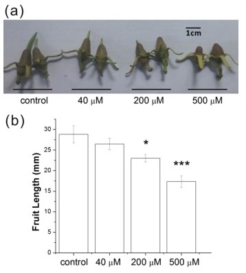 Figure 1. Efects of exogenous ABA on K. obovata fruit growth. (a) Fruit of K. obovata with or without exogenous ABA treatment. (b) Fruit length in (a). Mean ±SD values were determined from three replicates (n>40). Asterisks represents statistical signifcance (Student’s t-test, * and ***P <0 .05 and 0.001, respectively).