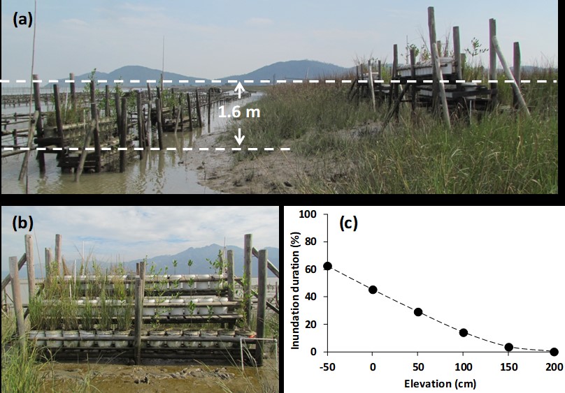 Figure 3. Marsh organ experiment. (a) Two of three lower and two of three higher platforms. (b) Close-up of one of the higher platforms, showing 12 buckets at each of three elevations. (c) Percent of time that the soil surface in buckets at each elevation were inundated by the tides over the course of the experiment. [Color figure can be viewed at wileyonlinelibrary.com]