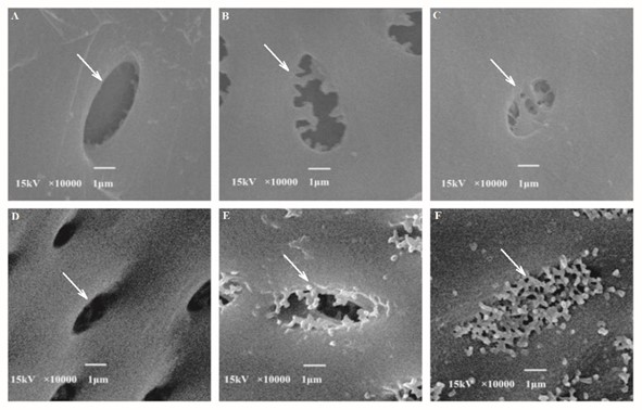 Figure 4. Scanning electron micrographs of different pit conditions: a clear pit in S. apetala (arrow) (A); a partially blocked pit in S. apetala (arrow) (B); a blocked pit in S. apetala (arrow) (C); a clear pit in S. caseolaris (arrow) (D); a partially blocked pit in S. caseolaris (arrow) (E); and a blocked pit in S. caseolaris (arrow) (F). Scale bars = 1 μm.