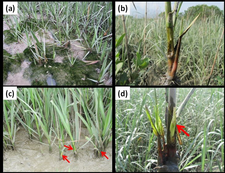 Figure 1. Photographs showing Spartina alterniflora grazing by rodents in Zhangjiang Estuary, China. From lower left clockwise: (a) new ramets of S. alterniflora grazed by rodents in early spring; (b) closeup view of a S. alterniflora stem grazed by rodents; (c) resprouting ramets of S. alterniflora from grazed stems in late spring; (d) S. alterniflora resprouts a few days after being grazed. The arrows indicate emerging resprouts from grazed stems.