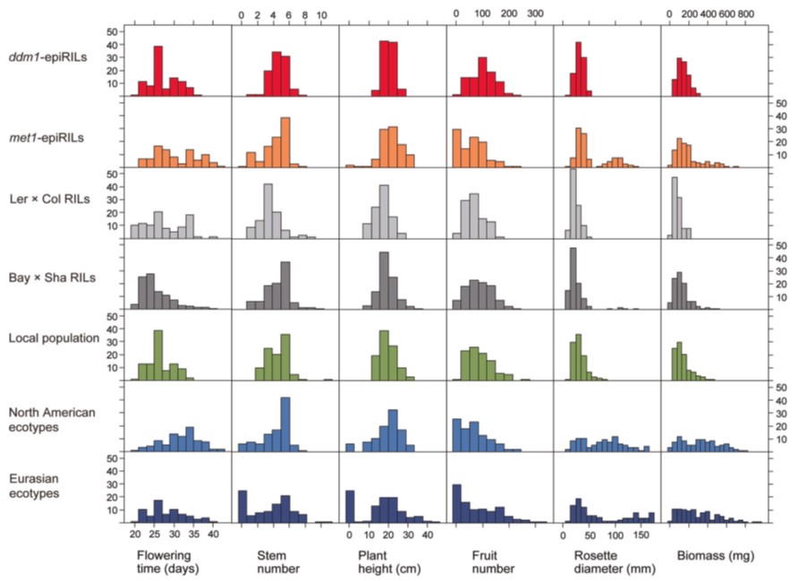 Figure 1 Distributions of phenotypes within different groups of Arabidopsis thaliana (RILs = genetic recombinant inbred lines; epiRILs = epigenetic recombinant inbred lines), for six different phenotypic traits, when compared in a common greenhouse environment. Plants with large rosette diameter (in met1-epiRILs, Bay × Sha RILs, and ecotypes) are late-flowering, whereas plants with zero height and number of fruits are individuals that did not bolt or flower during the experiment, possibly representing a winter-annual strategy. The geographic (Eurasian or North American) collections of ecotypes are in blue, the local European population in green, RILs in grey, and epiRILs in orange