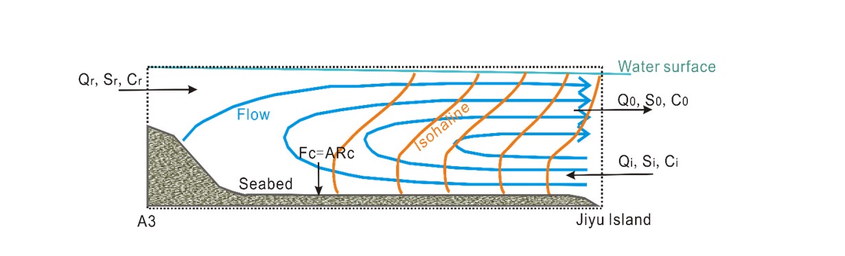 Figure 10. The schematic graph of estuarine mixing model of Jiulong Jiang Estuary, including the riverine input (Qr = river flow discharge, Sr = river flow salinity, Cr = sediment concentration of river input), the riverine output (Q0 = flow discharge to the sea, S0 = salinity of flow to the sea, C0 = sediment concentration of flow to the sea), the tidal input (Qi = flow discharge of tidal input, Si = salinity of tidal input, Ci = sediment concentration of tidal input) and the sedimentation of the seabed (Fc). The gray line marks the front between fresh water and salt water, which varies with mixing conditions. The A3 is where the North River meets the West River, which is used as the upper stream boundary of the box model.