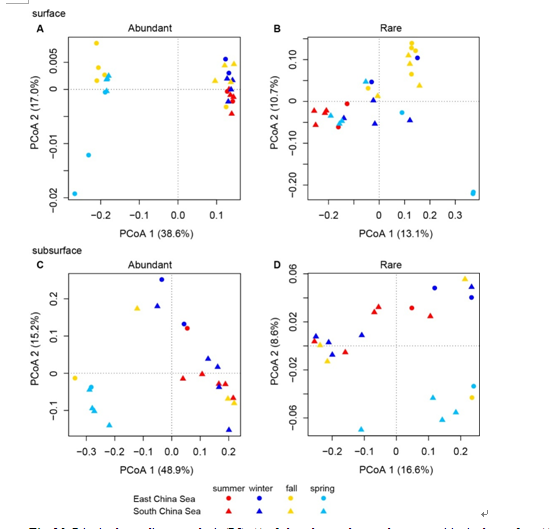 In this work, they compared patterns of abundant and rare picoeukaryotic sub-communities in the epipelagic waters (surface and 40–75 m depth subsurface layers) of the East and South China Seas across seasons via 454 pyrosequencing of the V4 region of 18S rDNA. They also examined the relative effects of environmental filtering, dispersal limitations and seasonality on community assembly. Their results indicated that (i) in the surface layer, abundant taxa are primarily influenced by dispersal limitations and rare taxa are primarily influenced by environmental filtering, whereas (ii) in the subsurface layer, both abundant and rare sub-communities are only weakly influenced by environmental filtering but are strongly influenced by dispersal limitations. Moreover, (iii) abundant taxa exhibit stronger temporal variability than rare taxa. They also found that abundant and rare sub-communities display similar spatial richness patterns that are negatively correlated with latitude and chlorophyll a and positively correlated with temperature. In summary, environmental filtering and dispersal limitations have different effects on abundant and rare picoeukaryotic sub-communities in different layers. Thus, depth appears as an essential variable that governs the structuring patterns of picoeukaryotic communities in the oceans and should be thoroughly considered to develop a more comprehensive understanding of oceanic microbial assemblages.