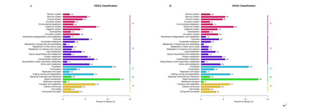 Fig. 13.KEGG classification ofTigriopusjaponicus(A) andPseudodiaptomusannandalei(B).