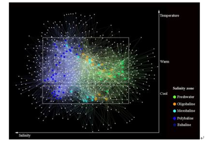Fig. 15.Operational taxonomic unit (OTU) network analysis of communities from all samples. Large nodes represent samples, whereas small nodes represent OTUs. The most relevant structuring features were salinity and temperature.