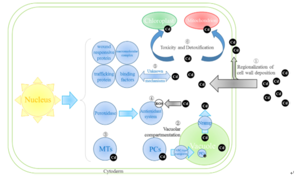 Fig. 19.The heavymetal tolerancemechanismin Avicenniamarina at molecular level. Depicted is a leaf cell. Cd2+ ions are possibly taken up into leaf cells by Ca2+ transporters. The cell wall could be the binding part of the Cd2+. In the cytosol, a part of Cd2+ is chelated by PCs and transported into the vacuole by an ABC-type transporter.MTs representmajor Cd binding sites important for detoxification. The antioxidant systemis crucial in preventing the formation of the highly toxic ROS.Wound responsive protein, trafficking protein,macromolecular complex and binding factors may play an important role in heavy metal resistance by some unknown mechanisms.