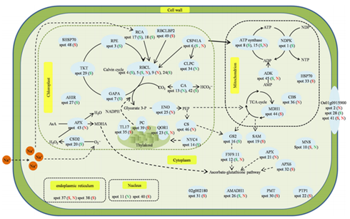 transcriptional levels of nine selected proteins were mostly consistent with their protein abundance exceptspot 46. Overall, the presented data demonstrated that NO has a positive effect on improving salt tolerance inA. marinaby regulating the protein abundance involved in photosynthesis, energy metabolism, primary metabolism and stress response.