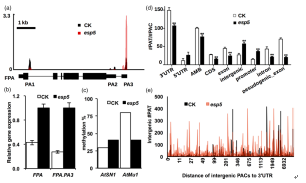 (e) Plot of the intergenic PATs with their distance (in bp) to the 30 untranslated region (UTR). Most of the intergenic PACs were upregulated in esp5, especially