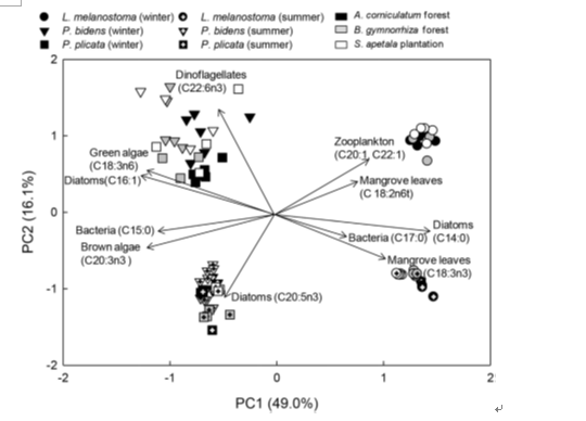 mangrove forests. Therefore, in this study, we used fatty acid analysis to compare the food sources of one
