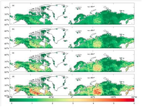 Fig. 1.Change in decadal mean annual net CH4 exchanges (NME, g CH4m-2 yr-1) between the 2010s and 2090s NME2090s-NME2010sover northern terrestrial ecosystems (north of 50°N), under four climate change scenarios: (a) RCP2.6, (b) RCP4.5, (c) RCP6.0, and (d) RCP8.5. Positive values indicate stronger sources or weaker sinks, and negative values indicate stronger sinks or weaker sources.