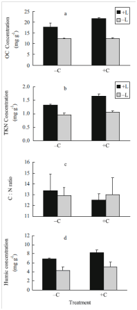 Fig. 1.Concentrations of sediment OC (a), TKN (b), C: N ratio(c), and humics (d) in different treatments (n = 4.-C-L:control without crab or leaf litter; +C-L: treatment with crab but without leaf litter; -C+L: treatment with leaf litter ofAegiceras corniculatumbut without crab; +C+L: treatment with crab and leaf litter)