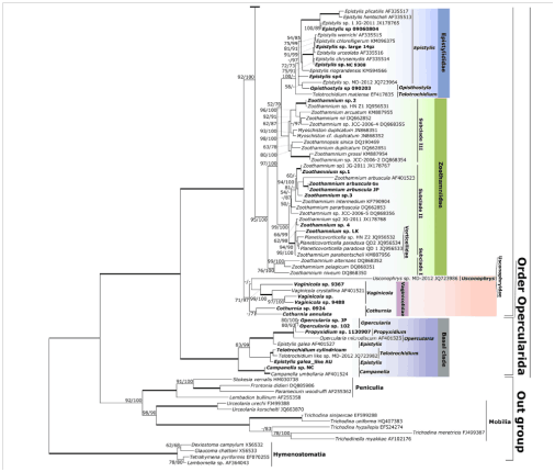 Fig. 2.The lower part of maximum likelihood (ML) tree of peritrichs with support values from maximum likelihood and Bayesian inferences (BI)
