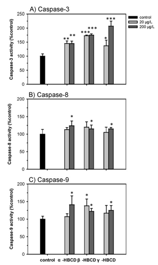 Fig. 5.Induction of the activities of caspase-3 (A), caspase-8 (B) and caspase-9 (C) inO. melastigmaembryos after exposure to 0, 20, and 200 μg/L of α-, β-, and γ-HBCDs. The values are presented as the mean ± SD (n = 4). Data presentation is same as Fig. 2.