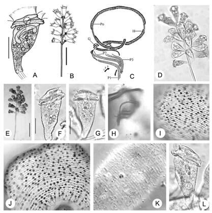 Fig.2.Zoothamnium paraniin. sp. from life (A, B, D–G, K, L) and after staining with protargol (C, H) and silver nitrate (I, J).A,F–G,L–living zooids at high magnification;B, D, E–colony form in vivo;C–entire oral infraciliature in ventral view, arrow marks epistomial membrane and arrow with umerals indicates numbering convention for polykineties and rows of kinetosomes within each polykinety;H–detailed arrangement of infundibular polykineties;I,J–silverline system;K– living zooid at high magnification focused to show the pellicular striations. G, germinal kinety; H, haplokinety;