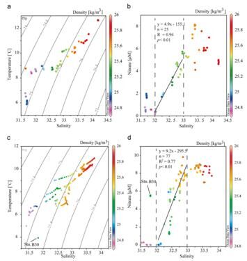 Fig.5.The T/S diagram of all stations and the relationship between nitrate concentrations and salinity in the central Yellow Sea during March 2007 (a and b) and 2009 (c and d). Location of Stn. B30 is indicated in Fig. 1b. The density is potential density anomaly (kg m-3).