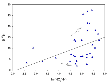 Fig.6.Relationship between NO3--δ15N and NO3-- N (p =0.02).