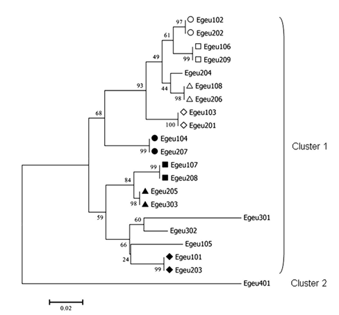 Fig.4.Maximum likelihood tree of the 21 confirmedEgeu-DABexon 2 nucleotide sequences. Theeight pairs of identically shared alleles amongEgeu-DAB1 – 3genes are respectively indicated by the same geometric patterns(e.g., hollow circle) to the left of the allele name