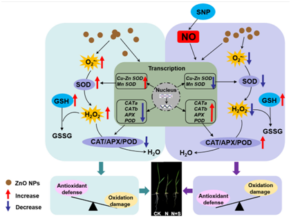 Nitric oxide (NO) has been found to function in enhancing plant tolerance to various environmentalstresses. However, role of NO in relieving zinc oxide nanoparticles (ZnO NPs)-induced phytotoxicityremains unknown. Here, sodium nitroprusside (SNP, a NO donor) was used to investigate the possibleroles and the regulatory mechanisms of NO in counteracting ZnO NPs toxicity in rice seedlings. Ourresults showed that 10 μM SNP significantly inhibited the appearance of ZnO NP toxicity symptoms. SNP addition significantly reduced Zn accumulation, reactive oxygen species production and lipid peroxidation caused by ZnO NPs. The protective role of SNP in reducing ZnO NPs-induced oxidative damageis closely related to NO-mediated antioxidant system. A decrease in superoxide dismutase activity, as well as an increase in reduced glutathione content and peroxidase, catalase and ascorbate peroxidase activity was observed under SNP and ZnO NPs combined treatments, compared to ZnO NPs treatment alone. The relative transcript abundance of corresponding antioxidant genes exhibited a similar change. The role of NO in enhancing ZnO NPs tolerance was further confirmed by genetic analysis using a NO excess mutant (noe1) and anOsNOA1-silenced plant (noa1) of rice. Together, this study provides the first evidence indicating that NO functions in ameliorating ZnO NPs-induced phytotoxicity.