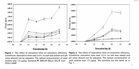 In the present study, a convenient and sensitive method for determination of six penicillinantibiotics (amoxicillin, ampicillin, penicillin G, oxacillin, cloxacillin, and dicloxacillin)in milk and honey samples was developed. Milk and honey samples were diluted withwater, then directly treated by stir bar sorptive extraction based on poly (vinylimidazoledivinylbenzene)monolithic material as coating. The analytes were analyzed by LC/ESIMS/MS. Several extraction parameters including extraction and desorption time, pH value,and ionic strength in sample matrix were investigated in detail. Under the optimized extractionconditions, the calculated detection limits for the target compounds were as lowas 0.23–2.66 ng/kg in milk and 0.18–1.42 ng/kg in honey, respectively. Good linearity wasobtained for analytes with the correlation coefficients (R2) above 0.997. Excellent methodreproducibility was achieved in terms of intraday and interday precisions, indicated by theRSDs of <5 .0 and <10.0%, respectively. finally, the proposed method was successfullyapplied to the determination of penicillin antibiotics residues in different milk and honeysamples.