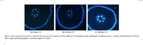 The effects of Si on growth, the anatomy of the roots, radial oxygen loss (ROL) and Fe/Mn plaque on theroot surface were investigated in Avicennia marina (Forsk.) Vierh. seedlings under Cd stress. Si promptedthe growth of seedlings and reduced the Cd concentration in the root, stem and leaf of A. marina. Siprompted the development of the apoplastic barrier in the roots, which may be related to the reductionof Cd uptake. The higher amount of ROL and Mn plaque on the root surface due to Si were also related tothe promotion of Cd tolerance in A. marina seedlings. Therefore, it is concluded that the alteration of theanatomy of the roots, the increase of ROL and Mn plaque of A. marina seedlings play an important role inalleviation of Cd toxicity due to Si.