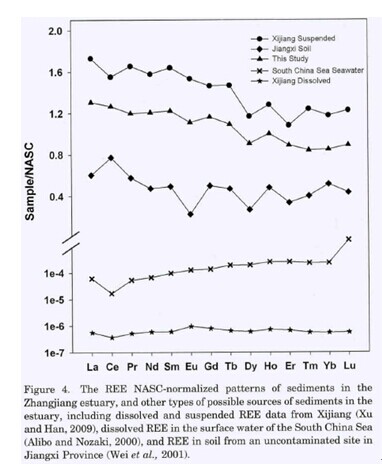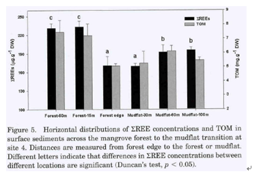 To examine the influence of the mangrove environment on the distribution of rare eartb elements (REE) in estuarinesediments, surface and core sediments were collected from regions of mangrove forest, forest fringe, and adjacentmudflat in the Zhangjiang estuary, SE China. Concentrations of REE were determined in surface sediments and coresamples using inductively coupled plasma mass spectrometry. Light REE were more enriched than heavy REE, with arelatively weak negative europium anomaly with respect to the North American shale composite in sediments of theZhangjiang estuary. Significant differences for REE were found among sampling sites and locations, following the ordermangrove forest, to forest edge, to mudflat. The main source for REE in the estuary is tbe weathered continentalmaterials from the Zhangjiang River drainage hasin. The mangrove environment affected the physicochemical featuresand thus affected the REE spatial distributions in sediments. Vertical REE distributions in core samples were altered bymangrove root activity. Mangroves played a significant role in controlling the horizontal and vertical distribution of REEin sediments of the Zhangjiang estuary.