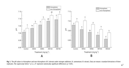The present study investigated nitrogen process in rhizosphere of Kandelia obovata under nitrogen input.Results showed that nitrogen additions significantly increased 4 kinds of enzyme activities (Urease, Nitrate reductase, Nitrite reductase and hydroxylamine reductase). The pH value increased to 7.1 underammonium addition, but decreased to 6.9 under nitrate addition. Potential Nitrification Intensity (PNI) increased 200–1500% compared with control under ammonium addition, and Potential Denitrification Intensity (PDI) increased more than 200% under nitrate addition. Ten types of organic acids were detectedfrom root exudates, which mainly included oxalic acid, tartaric acid, formic acid, acetic acid, and citricacid. The abundance of 5 kinds of microbial functional groups (nifH, AOA, AOB, nirS, nirK) responded differently. Total nitrogen in organs of K. obovata increased more than 200%. This indicated that nitrogenadditions accelerated the transformation of nitrogen directly and stimulated the exudation of root exudates and 5 kinds of genes indirectly.