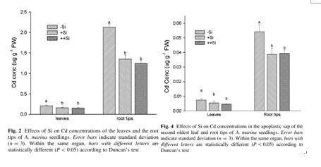 Mangrove plants seem to be highly tolerant ofhigh levels of heavy-metal pollution. Recently, someresearchers have focused on the mechanisms involved intheir metal uptake and tolerance. However, the importantmechanisms involved are still only partly understood. Thisinvestigation studied whether silicon (Si) affected cad-