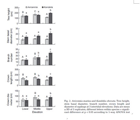 Differences in growth and physiological characteristics of saplings ofAvicennia marinaandKandelia obovatawere compared among 3 intertidal elevations. Growth performance of A. marina generally followed the order of the middle > lower > upper elevation. At the middle elevation,A. marinahad maximum values of tree height, branch number, crown length and diameter, shoot biomass and shoot to root biomass ratio (S:R). Differently, K. obovata exhibited best growth at the upper elevation, followed by the middle and lower elevation. Except for shoot biomass and S:R, all growth parameters ofK. obovatashowed a tendency to decline continuously with decreasing elevation. These different responses between the 2 species indicated thatA. marinais more tolerant to low elevation thanK. obovata. Decreasing elevation did not compromise gas exchange ofA. marinaleaves, while net photosynthetic rate, transpiration rate, stomatal conductance and intercellular CO2concentration ofK. obovataleaves declined sharply as the elevation decreased. Leaf chlorophyll (chl) a:b ratio and contents of chla, total chl and total carotenoid showed no significant differences among elevations for both species. With decreasing elevation, activities of superoxide dismutase and peroxidase increased significantly for both species, while significant increase in malonaldehyde contents was only recorded forK. obovata. With decreasing elevation, proline accumulation in leaves was accelerated for A. marina but not forK. obovata. These physiological responses also confirmed that A. marina is more tolerant to low intertidal elevation thanK. obovata.