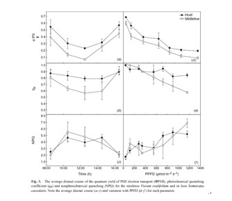 Xylem-tapping mistletoes are known to have generally higher transpiration rate (Tr), lower CO2 assimilation rate (A) and therefore lower water-use efficiency (WUE) than their hosts. There are long-standing contradictions in water relations and nitrogen use in photosynthesis. Gas exchange, chlorophyll fluorescence and nutrition components were investigated in a special mistletoe–host pair, Viscum ovalifolium–Sonneratia caseolar is, as the host was a mangrove growing in a saline environment. Our results show that both plants had high foliar N content, therefore it was consistent with the Nparasitism hypothesis, although the mistletoe had a lower Tr than its mangrove host. It was suggested that the mistletoe reduces its Tr under salt stress with N sufficient conditions. The mistletoe had a fundamental limitation of photosynthesis, and was photoinhibited with regard to high salinity, but it developed more photoprotection to thermal radiation. Additionally, both stomatal conductance (gs) and mesophyll conductance (gm) limitations on photosynthesis dominated in the mistletoe under salt stress even though it had a high foliar N content similar to the host.