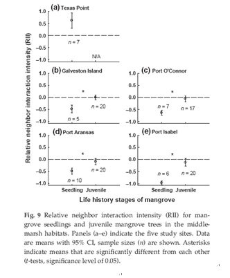 Many species are expanding their distributions to higher latitudes due to global warming. Understanding the mechanismsunderlying these distribution shifts is critical for better understanding the impacts of climate changes. Theclimate envelope approach is widely used to model and predict species distribution shifts with changing climates.Biotic interactions between species, however, may also influence species distributions, and a better understanding ofbiotic interactions could improve predictions based solely on climate envelope models. Along the northern Gulf ofMexico coast, USA, subtropical black mangrove (Avicennia germinans) at the northern limit of its distribution growssympatrically with temperate salt marsh plants in Florida, Louisiana, and Texas. In recent decades, freeze-freewinters have led to an expansion of black mangrove into salt marshes. We examined how biotic interactions betweenblack mangrove and salt marsh vegetation along the Texas coast varied across (i) a latitudinal gradient (associatedwith a winter-temperature gradient); (ii) the elevational gradient within each marsh (which creates different marshhabitats); and (iii) different life history stages of black mangroves (seedlings vs. juvenile trees). Each of these variablesaffected the strength or nature of biotic interactions between black mangrove and salt marsh vegetation: (i) Salt marshvegetation facilitated black mangrove seedlings at their high-latitude distribution limit, but inhibited black mangroveseedlings at lower latitudes; (ii) mangroves performed well at intermediate elevations, but grew and survived poorlyin high- and low-marsh habitats; and (iii) the effect of salt marsh vegetation on black mangroves switched from negativeto neutral as black mangroves grew from seedlings into juvenile trees. These results indicate that the expansionof black mangroves is mediated by complex biotic interactions. A better understanding of the impacts of climatechange on ecological communities requires incorporating context-dependent biotic interactions into species rangemodels.