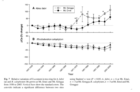 The correlation between forest decline andcalcium (Ca) depletion under long-term acid depositionremains elusive in China due to the high level ofCa deposition. We compared two species (Abies fabriand Rhododendron calophytum) for their growthpattern and base elements concentration in bothpolluted (Mt. Emei) and unpolluted (Mt. Gongga)sites in Sichuan, southwestern China. A. fabri grown atMt. Emei had poorer crown condition, slower radialgrowth rate, and lower seedling density under longtermacid deposition, which correlated closely with thereduced Ca concentration in foliage and tree-ring, incomparison with those at Mt. Gongga. In contrast, R.calophytum showed a stable Ca level and thusdisplayed normal growth between the two sites. Thedifferential capability of these two species to acclimateto poor Ca environment is one of the keys tounderstanding the long-term ecological effect ofchanging atmospheric acid and Ca deposition in thesubalpine forest in southwestern China.