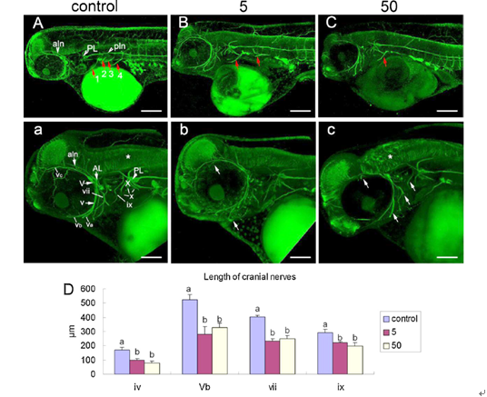 Fig. 1 Pyrene caused nervous system development defects ofSebastiscus marmoratusembryos as observed by immunostaining of acetylated α-tubulin. (A-C) are 10-fold magnifications of head and trunk and (a-c) are 20-fold magnifications of head. (D) The length of some cranial nerves are measured and analyzed. Data are presented as means ±S.E. (n = 8). Treatments not sharing a common letter are significantly different atP< 0.05 as assessed by one-way anova followed by the tukey hsd test.Abbreviations: aln, anterior lateral line nerve; AL, anterior lateral line ganglion; pln, posterior lateral line nerve; PL, posterior lateral line ganglion; V, trigeminal ganglion; v, trigeminal nerve; Va, upper mandible branch of the trigeminal nerve; Vb, upper jaw branch of the trigeminal nerve; Vc, anterior projecting branch of the trigeminal nerve; vii, facial nerve; ix, hypoglossal nerve; X, vagal ganglion; x, branches of the vagal nerve. Lateral views; anterior to the left. Scale bar A-C = 200µm; a-c = 100 µm