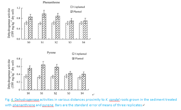 A greenhouse experiment was conducted to evaluate degradation gradient of spiked phenanthrene (Ph, 10 mg kg−1) and pyrene (Py, 10 mg kg−1) in rhizosphere of mangroveKandelia candel(L.) Druce. Rhizosphere model system was set up using a self-design laminar rhizoboxes which divided into eight separate compartments at various distances from the root surface. After 60 days of plant growth, presence of the plant significantly enhanced the dissipation of Ph (47.7%) and Py (37.6%) from contaminated sediment. Higher degradation rates of the PAHs were observed at 3 mm from the root zone (56.8% Ph and 47.7% Py). The degradation gradient followed the order: near rhizosphere > root compartment > far-rhizosphere soil zones for both contaminants where mangrove was grown. Contribution of direct plant uptake and accumulation of Ph and Py were very low compared to the plant enhanced dissipation. By contrast, plant-promoted biodegradation was the predominant contribution to the remediation enhancement. The correlation analysis indicates a negative relation between biological activities (microbial biomass carbon, dehydrogenase, urease, and phosphatase activity) and residual concentrations of Ph and Py in planted soils. Our results suggested that mangrove rhizosphere was effective in promoting the depletion of aromatic hydrocarbons in contaminated sediments.