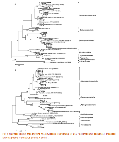 Phytoplankton blooms are a worldwide ecological problem and one of the major algae that cause phytoplankton blooms isAkashiwo sanguinea. Though much research has addressed the abiotic causes (e.g. growth condition) ofA. sanguineablooms, few studies have examined the dynamics of microbial communities associated with these blooms. In this study, polymerase chain reaction (PCR)-based denaturing gradient gel electrophoresis (DGGE) analysis of 16S rDNA genes was used to document changes in the phylogenetic diversity of microbial communities associated with anA. sanguineabloom that occurred in the Xiamen sea in May 2010. Surface sea water was sampled once a day within five consecutive days at four sites, and the microbial community composition was determined using DGGE. Sea water concentrations of chlorophyll a, nitrate and phosphate were also measured. The results indicated that theA. sanguineabloom was probably stimulated by low salinity (26-30%) and ended probably because inorganic nutrients were consumed and resulted in a N/P ratio unfavorable for this alga. Gammaproteobacteria populations increased significantly during bloom declines and then