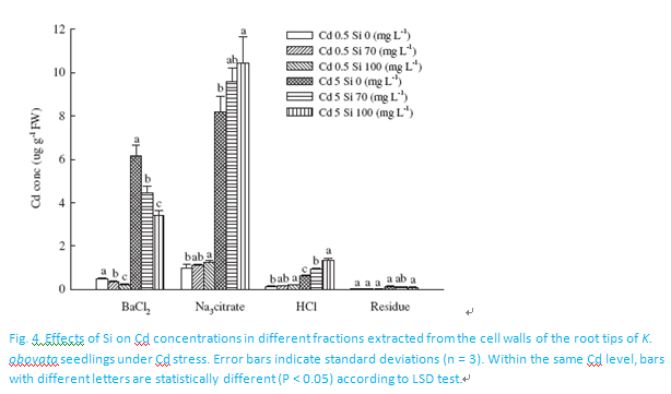 Ye J, CL Yan, JC Liu, HL Lu, T Liu and ZF Song.Environmental Pollution, 2012. 162: 369-373.The Effects of silicon (Si) on the distribution of cadmium (Cd) compartmentation in root tips ofKandelia obovata(S., L.) Yong were investigated by pot experiments. Cd concentrations in the apoplastic saps and symplastic fractions of the root tips ofK. obovataseedlings were decreased at both Si-supplied treatments. Si addition reduced the concentrations of BaCl2-extractable cell-wall-Cd in root tips, but increased the concentrations of Na3citrate-extractable cell-wall-Cd and HCl-extractable cell-wall-Cd in root tips. The total root-tip contents of Cd were mainly distributed in the apoplast and most of the Cd in the apoplast was bound to the cell wall. Our experiment found that Si increased the ratio of apoplast Cd (>87.08%) and reduced the ratio of Cd in the symplast (<12 .92%). this suggested that si enhanced binding of cd to the cell walls and restricted the apoplastic transport of cd.