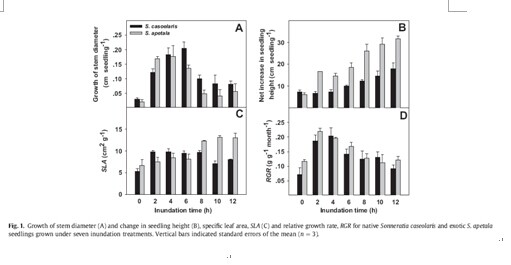 Luzhen Chen, Nora F.Y. Tam, Wenqing Wang, Yihui Zhang, Guanghui Lin.Estuarine, Coastal and Shelf Science,2013. 117:22-28.Sonneratia apetalaBuch.-Ham., an introduced mangrove species from Bangladesh, has been popularlyused in mangrove afforestation in China for more than 20 years. Whether there is an overlap in nichebetween this exotic species and native mangrove species is still unknown. The purpose of this study is toevaluate differences in growth and physiological responses to tidal inundation between the exoticS. apetalaand its congeneric species in China,Sonneratia caseolaris. A set of tidal tanks was used tosimulate different tidal ranges by controlling different inundation periods (0, 2, 4, 6, 8, 10, 12 h). Both theinundation period and species showed significant effects on almost all morphological, growth andphysiological parameters measured; however, there were no significant differences between the twospecies in the responses of these parameters to the inundation period, except for specific leaf area (SLA)and light compensation point (LCP). Significant increases in SLA under the long inundation periods(10, 12 h) for the exotic, but not for the native species, indicate that the exotic one tended to increase itsleaf area for assimilation. Thus, the exoticS. apetalaseedling exhibited phenotypic plasticity to tidalinundation similar that of the native,S. caseolaris, which suggests that the exotic and nativeSonneratiaspecies will occupy a similar niche along the entire tidal range.