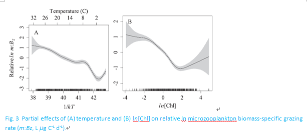We evaluated a hypothesis derived from the metabolic theory of ecology (MTE) that the ratio of microzooplankton herbivory (m) to phytoplankton growth (µ) will arise in a warming ocean because of the different temperature dependencies of autotrophic and heterotrophic organisms. Using community-level growth and grazing data from dilution experiments, generalized additive models (GAMs) were constructed to describe the effects of temperature and chlorophyll on m: m. At low chlorophyll levels,m:µdecreases with increasing temperature, whereas at high chlorophyll levels,m:µincreases initially with temperature before reaching a peak and then declines. These complex responses ofm:µresult from mixed effects of temperature and chlorophyll on microzooplankton biomass (Bz), biomass-specific microzooplankton grazing rate (m:Bz), and phytoplankton growth rate (µ).Bzdecreases with rising temperature and increases with rising chlorophyll.m:Bzincreases with temperature and decreases with chlorophyll. Nutrient-enriched growth rate of phytoplankton (µn) and m increase with increasing temperature and chlorophyll. Holding chlorophyll constant, the calculated activation energies ofm:Bzandµnare 0.67 6 0.05 and 0.36 6 0.05 eV, respectively, both consistent with previous MTE estimates for heterotrophs and autotrophs. Our study indicates that warming may enhance phytoplankton losses to microzooplankton herbivory in eutrophic but not in oligotrophic waters. The GAM analysis also provides important insights into underlying system relationships and reasons why community-level responses in natural systems may depart from theory based on laboratory data and individual species.