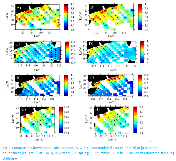 We modeled the abundance distribution of heterotrophic bacteria collected from 4 cruises in the northern South China Sea using generalized additive models to infer the underlying mechanisms controlling bacterial abundance and to predict bacterial abundance using environmental parameters that can be easily obtained. We incorporated spatial coordinates, depth, month, chlorophyll (Chl) a concentration, temperature, salinity, nutricline and mixed layer depth in the model, which captures the main features of the observations and explains 88% of the total variation of bacterial abundance. The most important factor affecting bacterial abundance is chlorophyll, followed by salinity and nutricline depth, reflecting the importance of carbon and nutrient sources to bacteria. Bacterial abundance shows a unimodal relationship with temperature and decreases with depth. All the functions are nonlinear. After controlling environmental parameters, bacterial abundances are higher in fall and winter than in spring and summer and usually show an onshore–offshore decreasing gradient, which probably signify transportation pathways of terrestrial organic matter to the sea via atmospheric deposition. Comparisons of variograms between raw data and residuals of the model show that positive autocorrelation at small scales is induced by both environmental similarity and geographic proximity, while the negative autocorrelation at large scales is mostly contributed by environmental similarity in remote water masses.