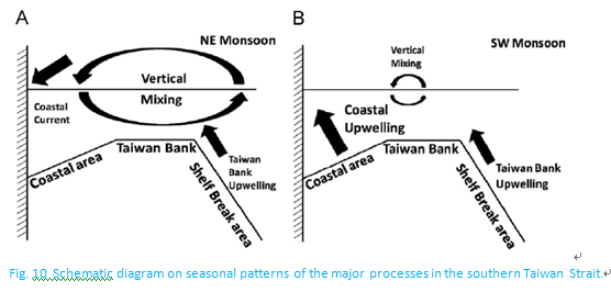 The impact of monsoon on the temporal and spatial variations of phytoplankton standing stock (Chla) in the southern Taiwan Strait was studied based on long-term satellite data (1997–2008) and field observations (during 1987–1988 and 2006–2007). During the NorthEast (NE) monsoon, the high Chl a was induced by vertical mixing, the Zhejiang–Fujian Coastal Current and upwelling. However, for most of the area, the vertical mixing was the dominant process that enhanced phytoplankton growth. During the SouthWest (SW) monsoon, two low temperature and high Chl a areas were observed: one near the Dongshan Island and the other in the southeast edge of the Taiwan Bank. Both of them were identified as the upwelling areas a half century ago. The Dongshan upwelling is mainly caused by the cold waters, which is derived from the famous ‘‘East Guangdong upwelling’’ induced by the SW monsoon. And the latter upwelling is mainly induced by a shallowing of the topography and the Kuroshio intrusion. In the last decades, most of the studies suggested that the Chl a during the SW monsoon is higher than that during the NE monsoon, due to the upwelling and cold temperature, respectively. However, some recent studies made contrary conclusion. Using the satellite seasonal climatological Chladata (SeaWiFS and MODIS), we acquired more extensive and long-term records and found a significant difference in the temporal variation patterns of Chl a concentrations in the three sub-areas of southern Taiwan Strait. In the coastal area, two Chlapeaks were observed, which were due to upwelling during the SW monsoon and Zhejiang–Fujian Coastal Current during the NE monsoon. On the Taiwan Bank, the high Chl a occurred throughout the year due to the topographical upwelling all year round. For the shelf break area, a higher Chlawas observed during the NE monsoon, which was induced by vertical mixing. For the whole study area, a significant coupling occurred between Chlaand wind speed (r2=0.23, p<0 .05) during the ne monsoon, while it was very weak during the sw monsoon. on the other hand, the mean surface chlawas significantly higher in the NE monsoon (0.69 mg m-3) than in the SW monsoon (0.53 mg m-3). All these results demonstrated that the temporal and spatial variations of phytoplankton standing stock were affected by the East Asia monsoon system in the southern Taiwan Strait.