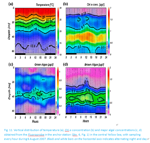 Vertical distributions of phytoplankton biomass and community structure were studied in the summer stratified central Yellow Sea (YS) using a submersible spectrofluorometer (Fluoroprobe, bbe Moldaenke, Germany), along with photosynthetic pigments analysis (HPLC-CHEMTAX), and microscope observation. Above all, the results of the dominating group obtained from these methods generally coincided with each other on the transect 35°N. The concentrations of brown algae, green algae and total chlorophylla(Chla) biomass were highly correlated between the results of Fluoroprobe observations and pigments analysis (r= 0.79, 0.91 and 0.82, respectively, n = 54, p<0 .01). in the summer stratified central ys, significant differences in phytoplankton compositions on the vertical distribution was observed. on the basis of hplc-chemtax results, the dominating group of phytoplankton composition generally changed from cyanobacteria to chrysophytes and then to diatoms, from surface to bottom. interestingly, on the basis of high-resolution observations using fluoroprobe, a periodic fluctuation of the pycnocline presumably due to the semidiurnal internal tides was observed at an anchor station (35°n, 123°e). in addition, both nutrients and chlaconcentrations at the depth of the subsurface chlorophyll maximum (SCM) seemed to coincide with the rhythm of the pycnocline fluctuation, indicating the latter might have a potential impact on the dynamics of SCM phenomena in the summer stratified central YS.
